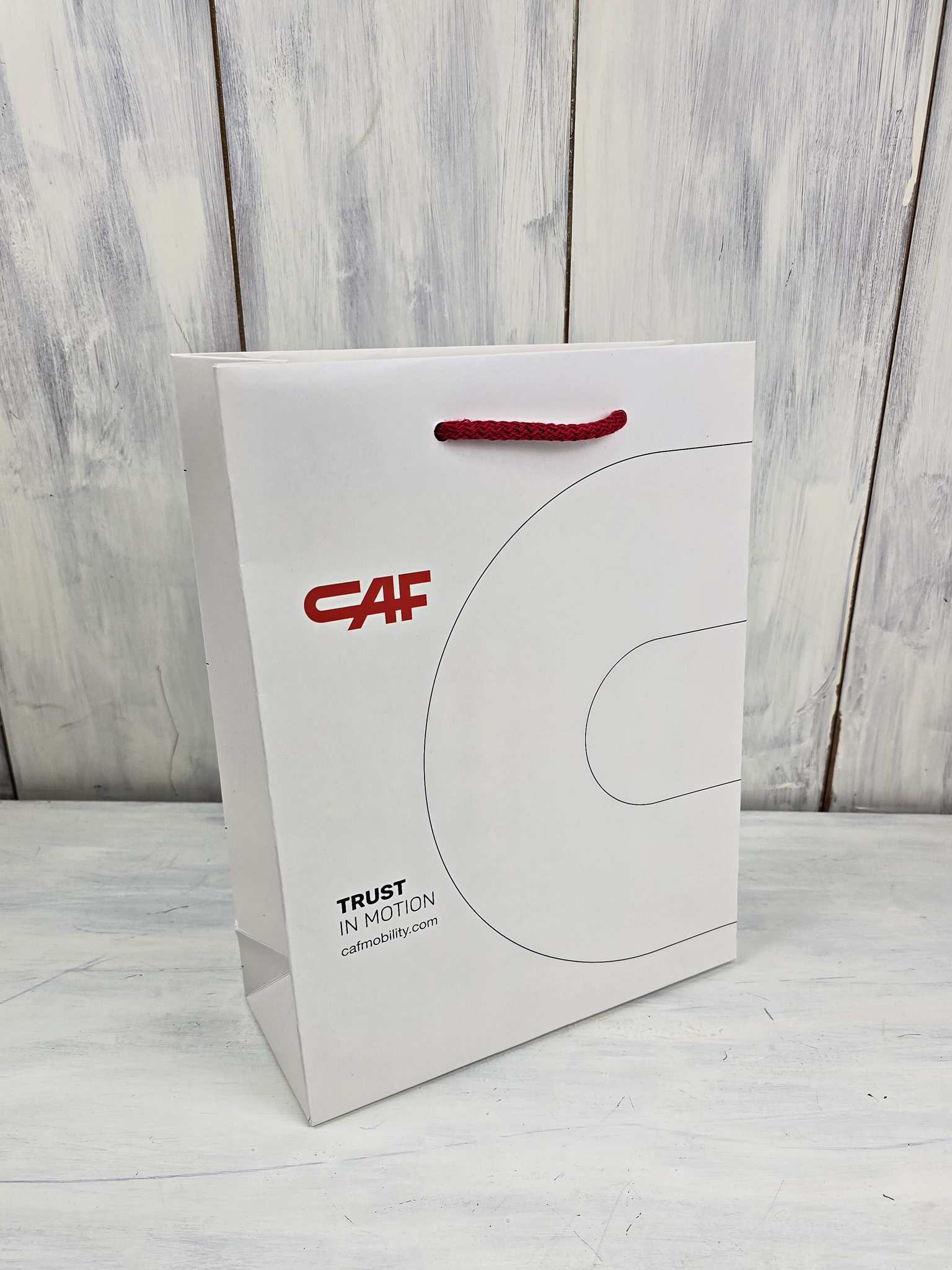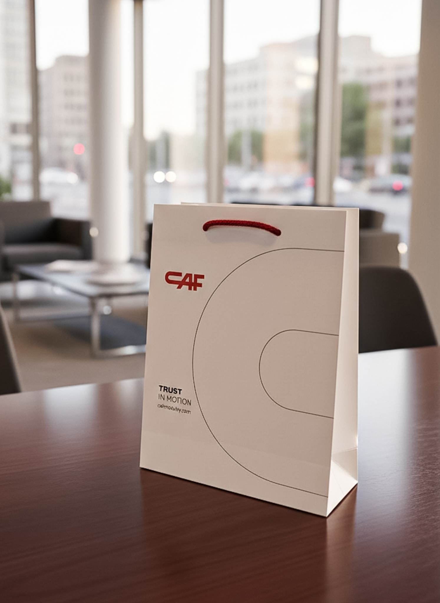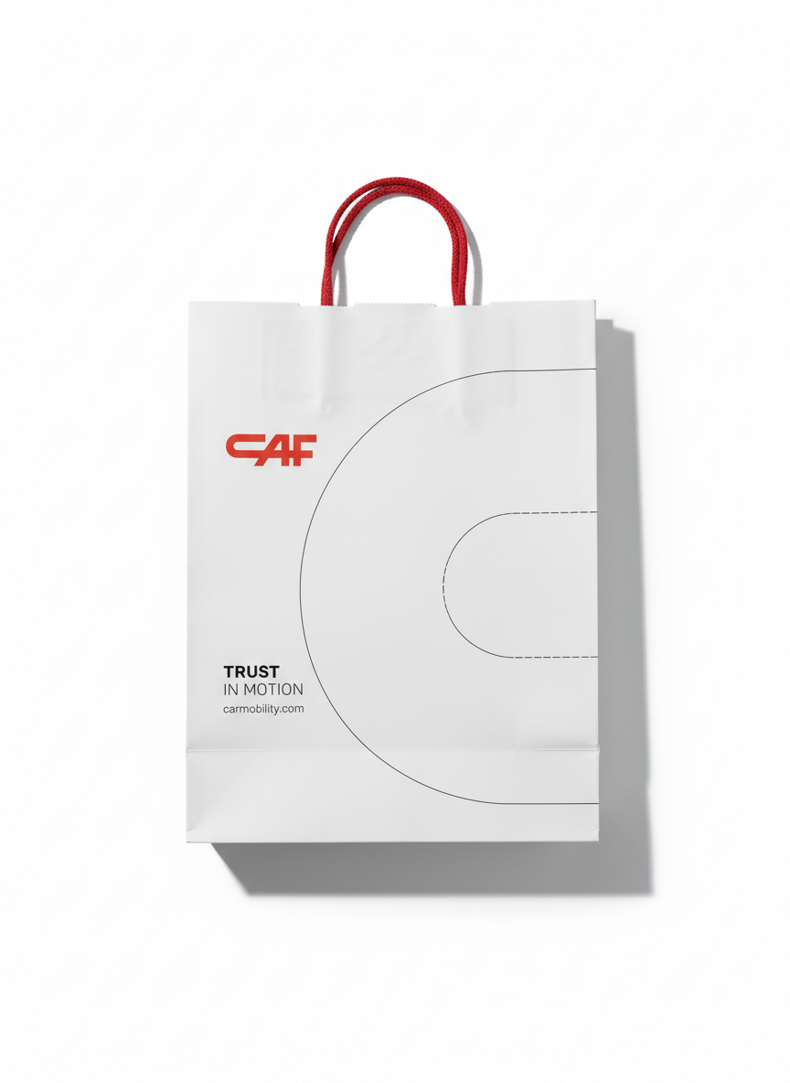 Para CAF desarrollamos el diseño de una bolsa de papel corporativa pensada como un elemento práctico y representativo de su identidad visual. El proyecto se centró en trasladar la imagen de la marca a un soporte sostenible y de uso cotidiano, cuidando tanto el diseño gráfico como los acabados. El resultado es una bolsa funcional y resistente, concebida para reforzar la presencia de CAF en eventos y acciones corporativas, alineándose con una comunicación responsable y coherente con los valores de la empresa.