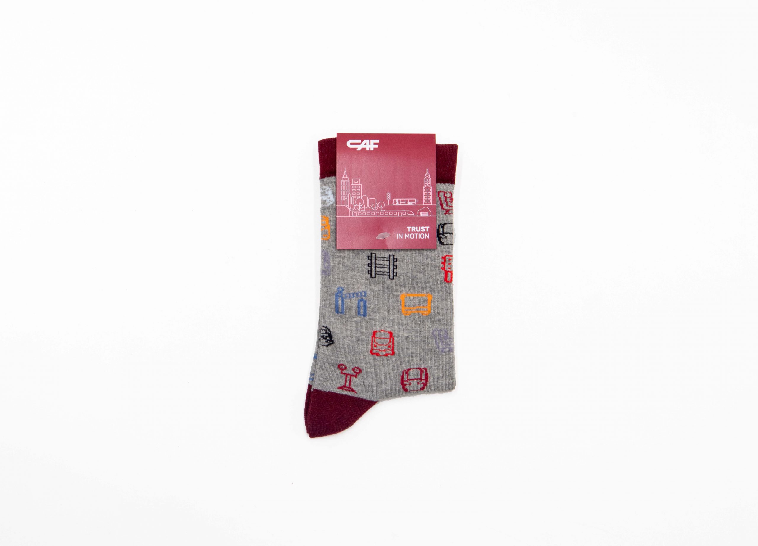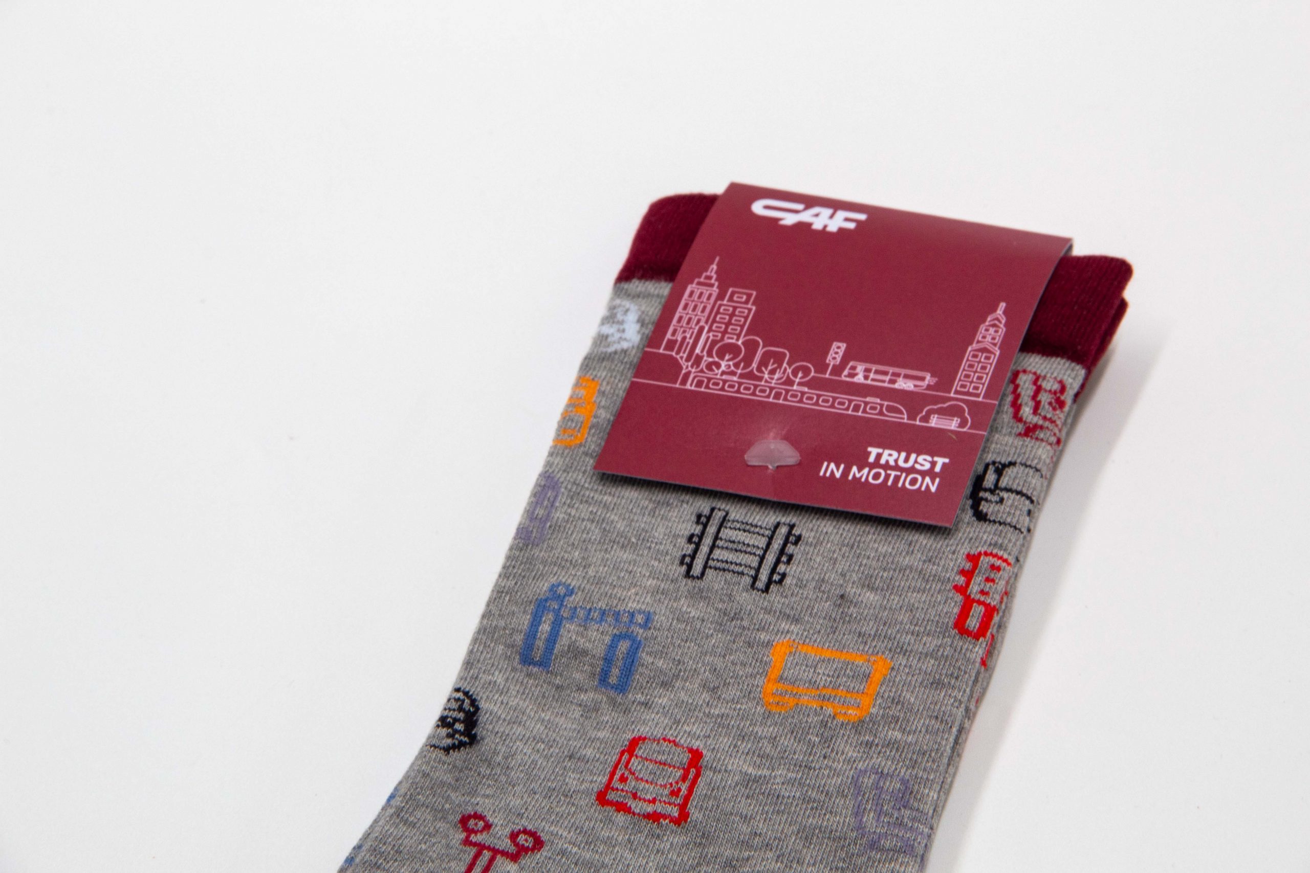 Para CAF desarrollamos el diseño de unos calcetines personalizados como pieza de merchandising corporativo. El diseño incorpora ilustraciones de trenes como elemento gráfico principal, haciendo referencia directa al ámbito ferroviario de la empresa. El resultado es un producto funcional y visualmente reconocible, pensado para trasladar la identidad de CAF a un soporte cotidiano mediante un diseño cuidado y coherente con su universo visual.