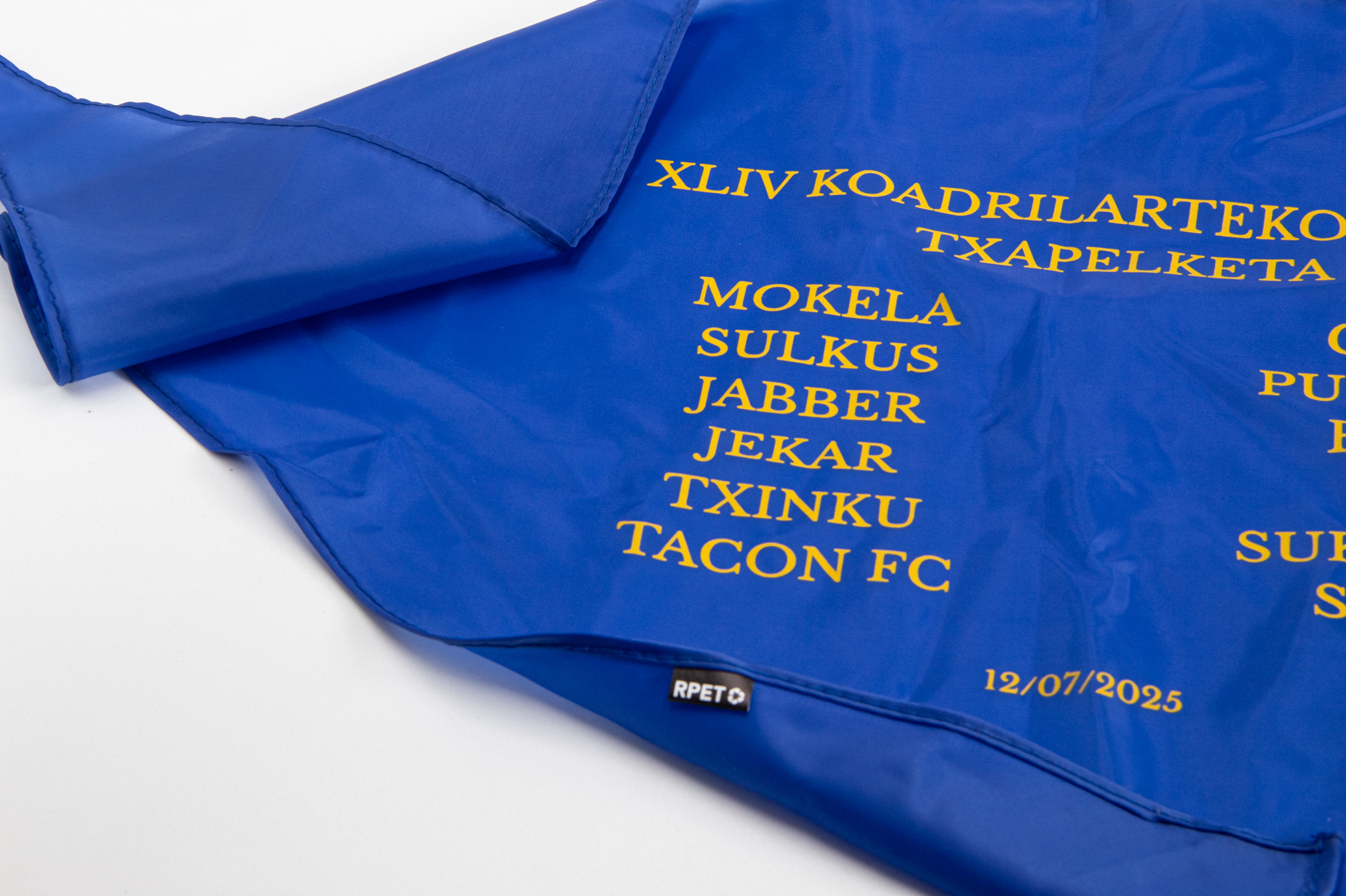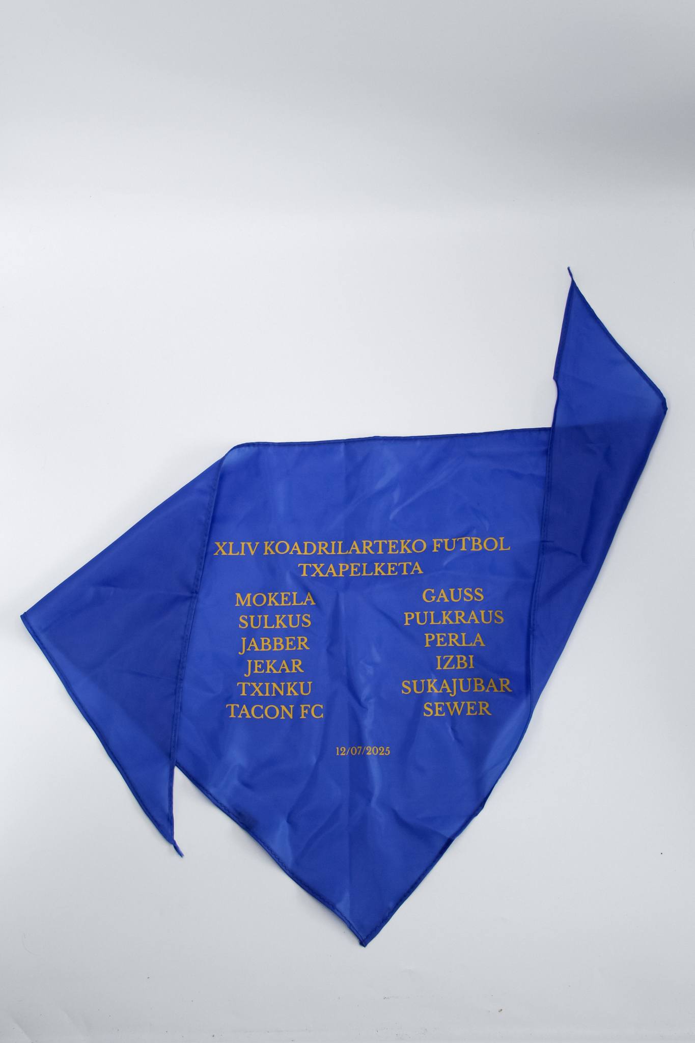 Para Kuadrilla Txapelketa desarrollamos el diseño de unos pañuelos con un enfoque sencillo y funcional, pensados para representar a todas las cuadrillas participantes. El diseño integra de manera clara los nombres de cada cuadrilla, creando un producto visualmente limpio y reconocible que sirve como recuerdo del evento.